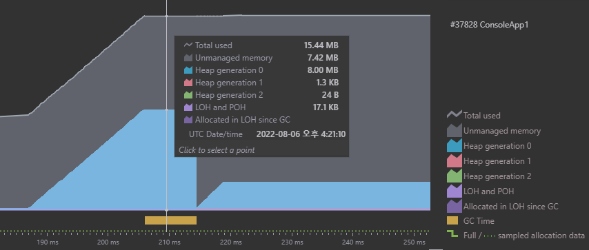 이번에는 임시 배열을 stackalloc과 Span<T>를 사용하여 스택에 할당하도록 고친 뒤 이를 실행해보면 ..