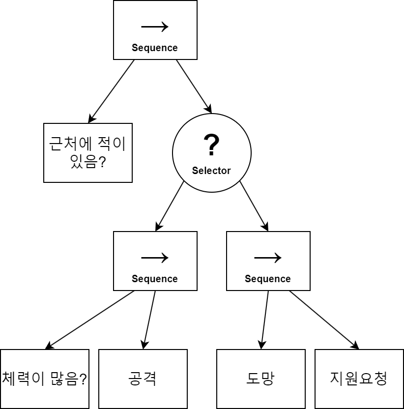 Selector와 Sequence를 조합하여 적이 있는 경우 체력이 많으면 공격하고 아니면 도망친뒤 지원 요청을 하는 경우.