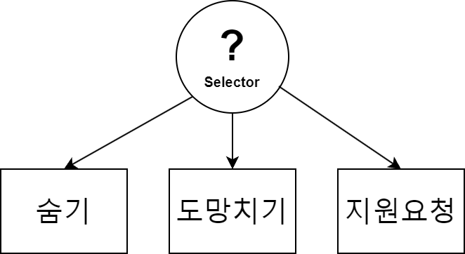 Selector를 이용하여 (숨기, 도망치기, 지원요청) 중 한 가지의 행동만 수행하는 경우.