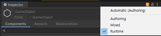 인스펙터 우상단을 보면 여러 모드가 있는데 이걸 Runtime으로 바꿔주면