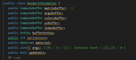 아무튼 파브리지오 작업의 핵심은 한 메테리얼의 하나의 엔티티(BufferEntity)라는 것이다. 그리고 메테리얼 엔티티 안에 SpriteIndex (int : 몇 번째 스프라이트를 그려줄지) , SpriteMatrix (float4 : x,y 위치값, 스케일(uniform), z축회전값), SpriteColor(float4 : RGBA), 타입의 DynamicBuffer가 존재한다.