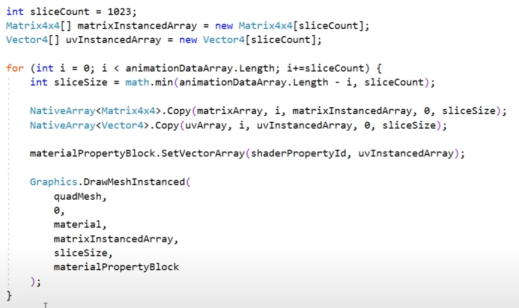 나쁘지는 않지만? 최선인지는 모르겠다. 특히 1023개씩 쪼개서 DrawMeshInstanced에 넘겨주는 것이 메모리 복사를 너무 많이하지 않나 싶다.