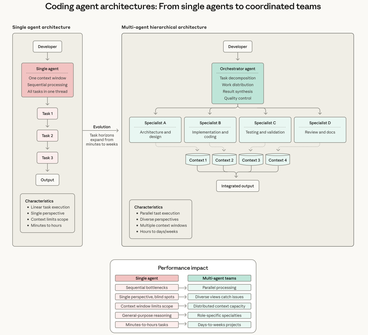 단일 에이전트 워크플로는 하나의 컨텍스트 창을 통해 태스크를 순차적으로 처리한다. 멀티 에이전트 아키텍처는 오케스트레이터가 병렬로 작동하는 특화된 에이전트들을 조율한다. 각 에이전트는 전용 컨텍스트를 가지며, 결과는 통합 출력으로 합성된다.