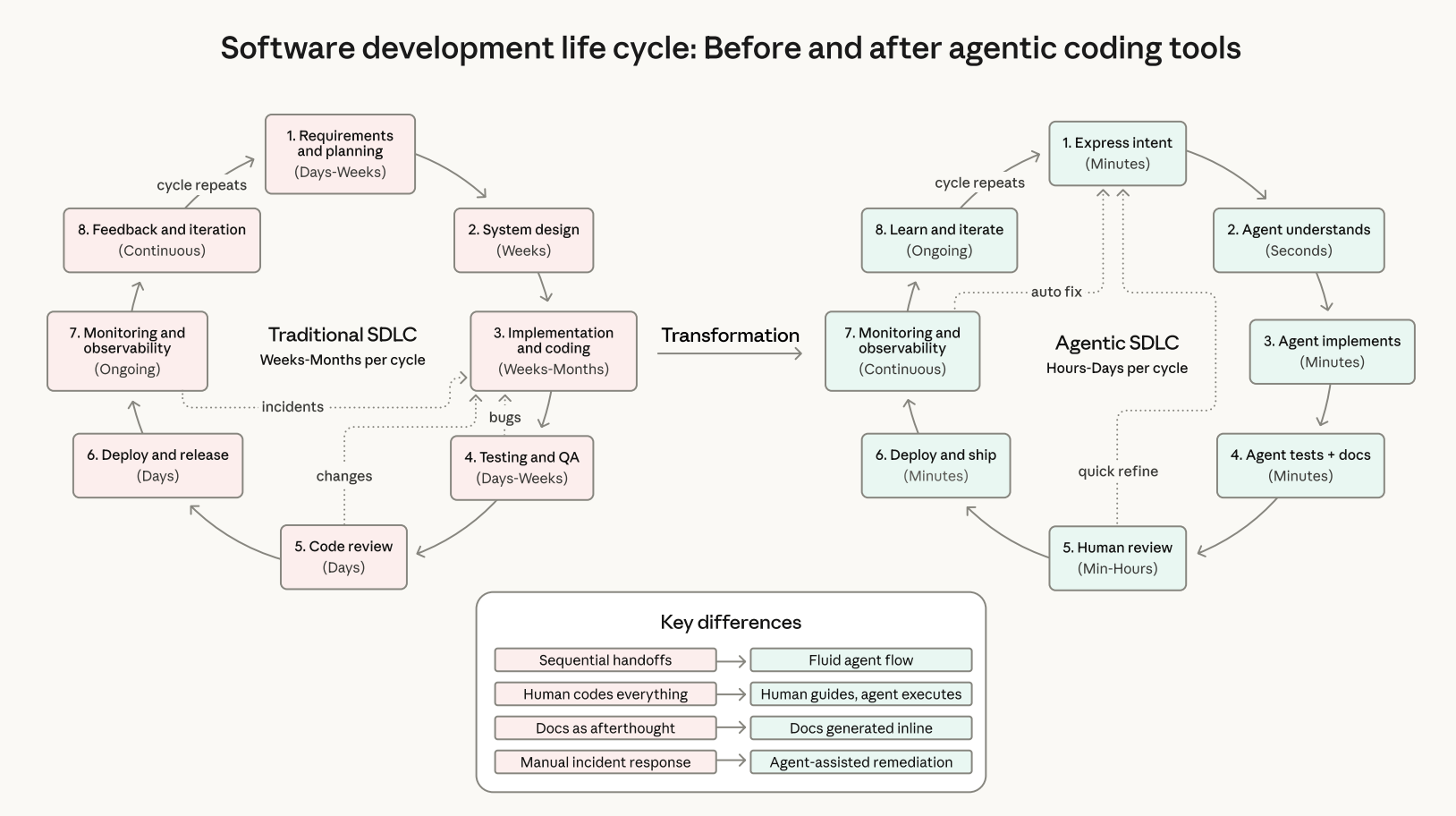기존 SDLC 단계들은 유지되지만, 에이전트 주도 구현과 자동화된 테스팅, 인라인 문서화가 주기 시간을 수 주에서 수 시간으로 압축한다. 모니터링 결과가 빠른 반복 주기에 직접 피드백된다.