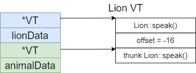 그래서 Lion VT에서는 offset을 저장한다. 이때 animal의 VT를 통해 speak()를 호출하더라도 Lion::speak()를 호출하지는 않는다. 대신 '오프셋을 계산해서 호출하는' speak() 함수를 만드는데 바로 thunk이다. 그런데 이렇게 되면 만약 Lion 포인터를 이용한 경우에는 offset을 계산하면 안 되므로 일반적인 Lion::speak()를 또 VT에 저장한다.