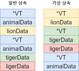 다시 말하면, 일반 상속의 경우 Lion객체를 Lion 포인터로 가리키든 animal 포인터로 가리키든 시작 위치는 같지만 가상 상속의 경우 포인터가 가리키는 시작 위치가 달라져서 lionData의 위치를 알 수 없다는 것.