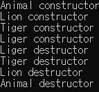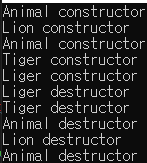 그리고 Liger 객체를 생성한 뒤 생성자와 소멸자의 호출 순서를 보면 위와 같이 출력이 되는데, animal의 생성자와 소멸자가 각각 2번씩 호출된 것을 확인할 수 있다. 그 이유는 위의 Liger의 객체의 구조를 보면 Lion, Tiger, Liger 객체를 순서대로 생성하는데, 이때 Lion과 Tiger가 생성될 때 Animal 객체를 생성하므로 Animal 객체가 두 번 생성되는 것이다.