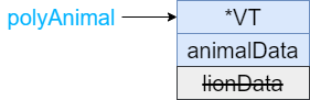 여기서 polyAnimal는 animal 포인터이기 때문에 animal 오브젝트의 VT와 animalData밖에 보지 못한다. 즉, lionData를 알 수 없다.