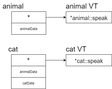 이렇게 되면, cat객체를 생성한 뒤 그것을 가리키는 게 animal 포인터이든지 cat 포인터이든지 상관없이 cat의 VT를 참조하여 speak()를 찾는다. 위에서 말한 base 클래스의 destructor도 같은 이유로 virtual로 해주어야 한다.