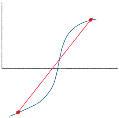 위 그림과 같은 상황에서 만약 이분법이었다면 매 step을 반복할 때마다 구간이 1/2씩 줄어들었을 것이다. 즉, 위와 같은 상황에서 가위치법은 이분법보다 느리다. 이때 오른쪽 위의 점과 같이 계속 선택되는 점을 정체점(stagnation point)라고 한다.