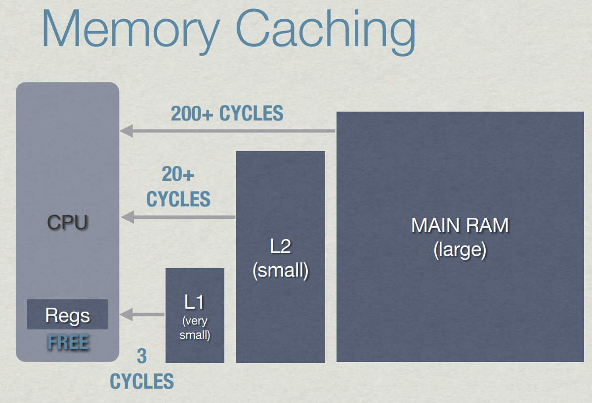 그렇다면 메모리에 접근하는 속도는 몇일까? 물론 하드웨어마다 다르겠지만 보통 L1 캐시는 3 cycle, L2~3 캐시는 10~30 cycle, 메모리는 200cycle(s) 이 필요하다고 가정하자.