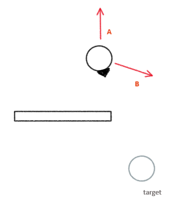 위와 같은 상황에서 독립된 동작들을 혼합하는 방식은 벽을 피하기 위해 A와 같은 결과를 내놓을 것이다. 캐릭터는 결국 타겟을 쫓아갈 수 있지만 벽에 근접한 순간 속도가 크게 감소하게 되어 타겟을 쫓아가는데 더 오랜 시간이 걸리게 된다.