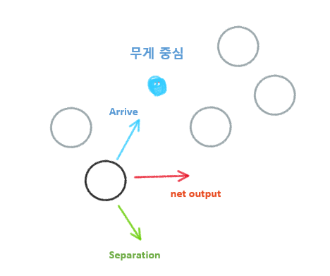 위 동작의 경우 무리의 무게중심을 타겟으로 하는 도착(Arrive)동작과 분리(Separation) 동작을 조합하면 된다.