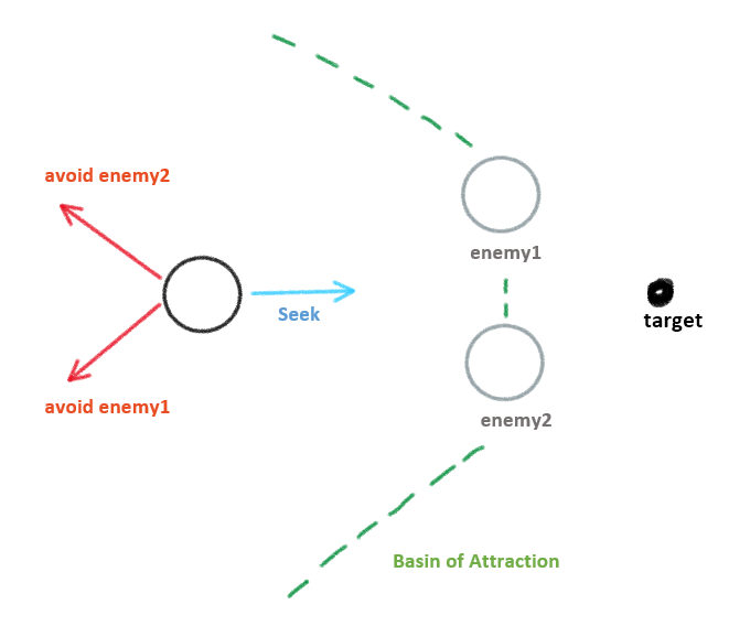 만약 Wander같은 동작을 우선순위가 낮은 그룹으로 추가한다면 앞서 언급한 평형 상태를 빠져나올 수 있다. 이 방법은 불안정 평형 상태에서는 잘 먹히지만 끌림 영역이 큰 안정 평형 상태에서는 여전히 동작하지 않을 수 있다.