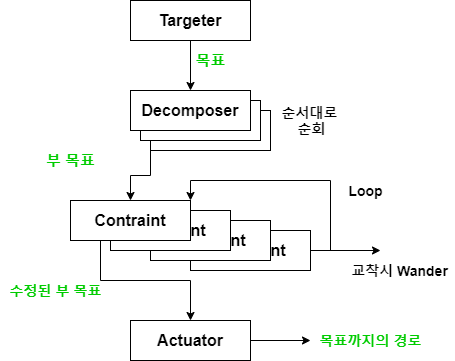 - 한 제약을 피하는 방법이 다른 제약을 위반할 수 있기 때문에 루프를 돌면서 모든 경우를 확인한다. 교착(deadlock)상태에 빠진 경우 정해진 동작을 수행한다. (보통 Wander를 수행)