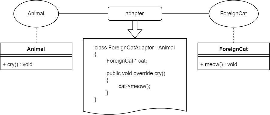 위 다이어그램처럼 외부에서 가져온 ForeignCat은 cry()메서드가 없지만 어댑터를 통해 기존 인터페이스와 호환되게 동작하도록 만들어줄 수 있다.