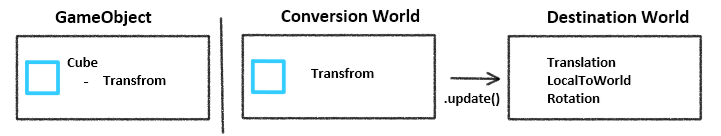 가끔 코드를 보면 DestinationWorld, DstManager 이런 이름들이 나오는데 Destination World란 Conversion이 모두 끝난 후의 World라고 생각하면 된다. Conversion 월드에서는 Monobehaviour와 GameObject를 추출하고 여기서 업데이트가 한 번 일어나면 Destination World에 변환된 Component들이 추가된다.