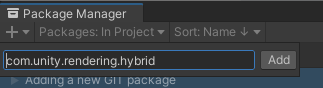 그다음 com.unity.rendering.hybrid를 적고 Add를 누른다. (알아서 최신으로 깔아줌)